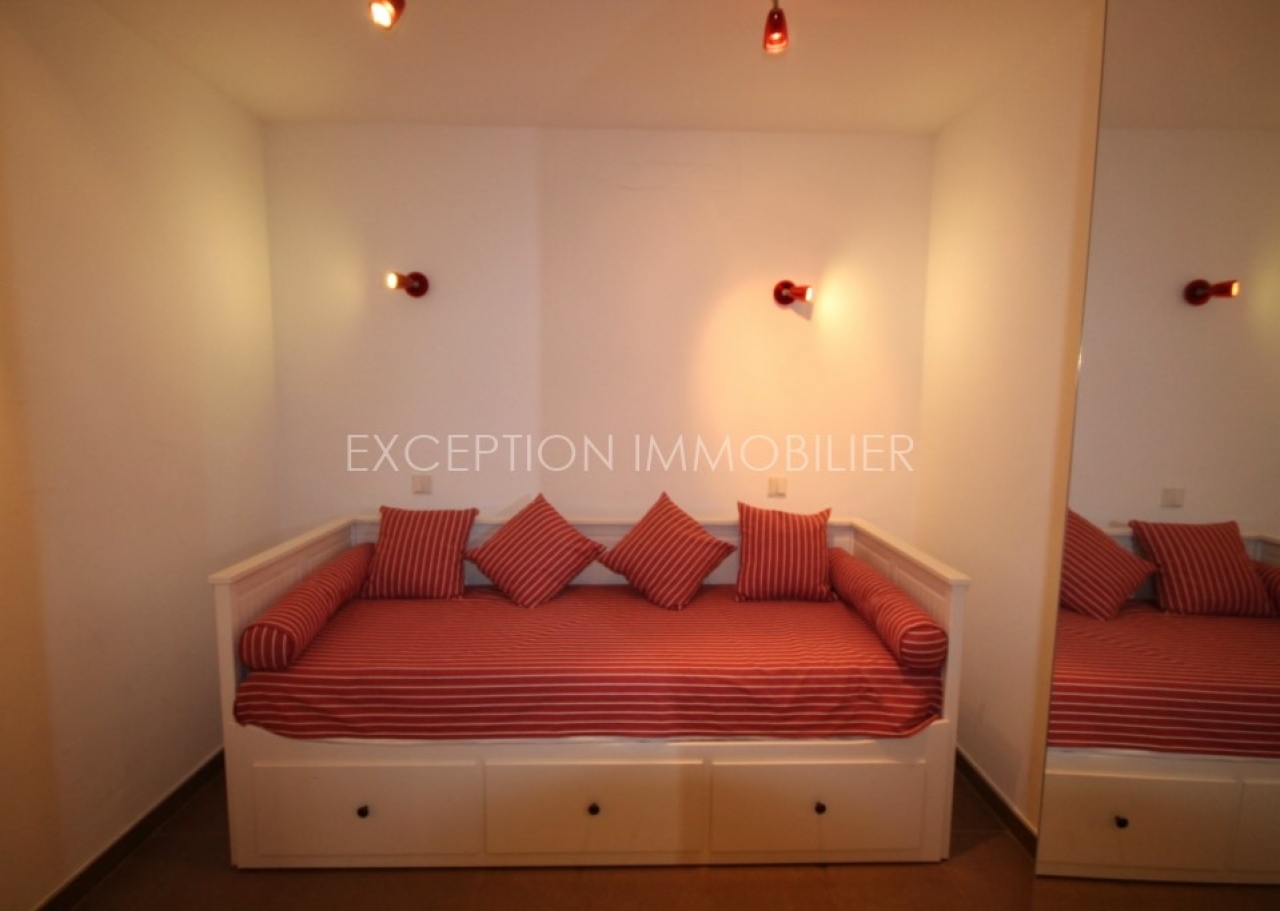 The apartment includes entrance, living space with living room and equipped kitchen with central island, 1 bedroom with air conditioning opening onto a little patio, 1 small children's bedroom in alcove, 1 shower room, independent toilets.